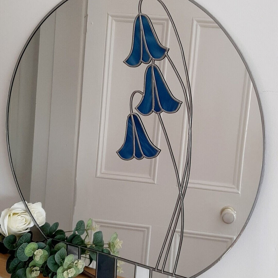 59cm diameter Bluebell design stained glass style mirror. Easy to hang with included brackets and fitting instructions. Each mirror is unique due to handmade marbling effect film. Colour settings may vary on different monitors.