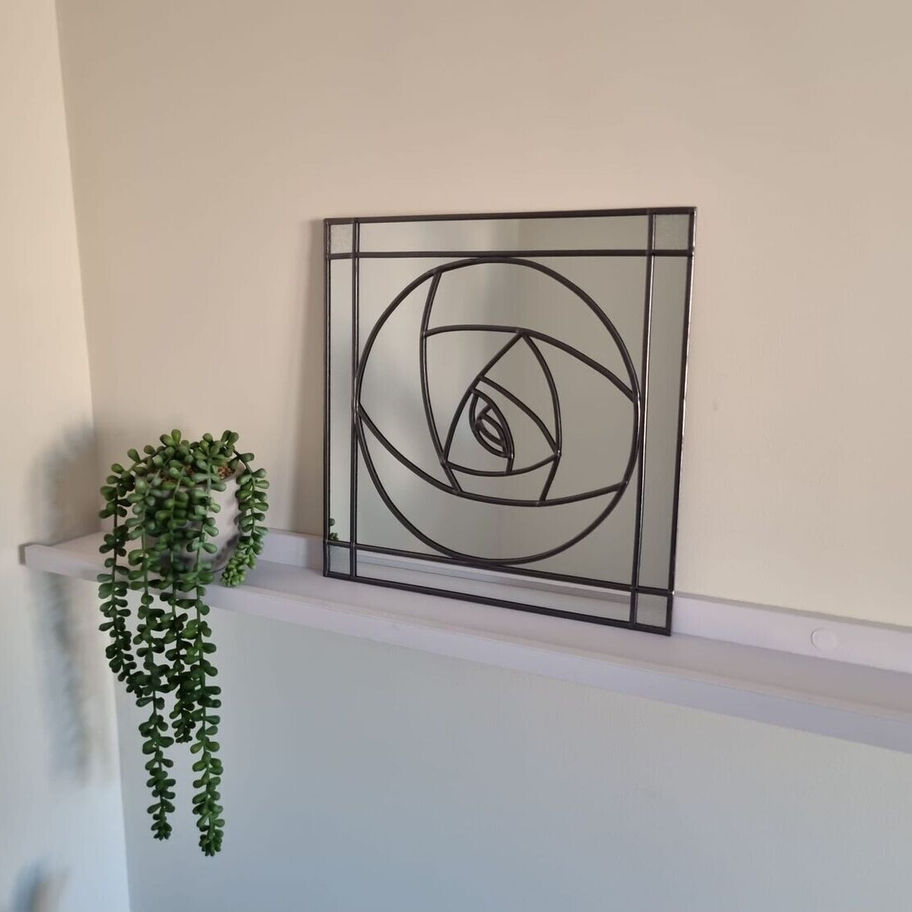 This 30x30cm mirror features a modern Charles Rennie Mackintosh design with a stained glass style. Each piece is handmade, resulting in unique variations in lines and symmetry. The mirror includes a picture hook style fixing and uses a handmade marbling effect film, ensuring each mirror is one-of-a-kind.