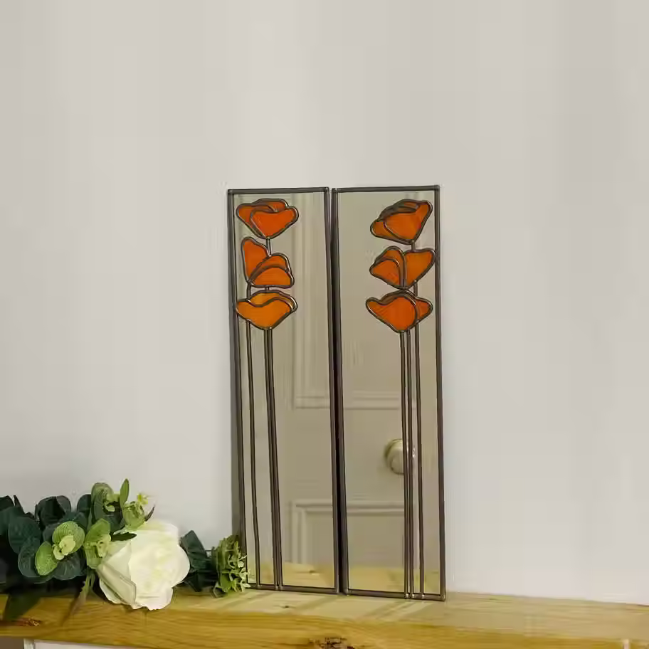 This Triple Red Poppy design stained glass effect mirror adds style to any room. Each mirror is handmade, leading to unique variations in lines and symmetry. The marbling effect film used is also handmade, ensuring Charles Rennie Mackintosh inspired mirror is one-of-a-kind. The mirror is hung with a picture hook style fixing.